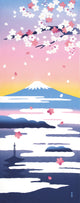This tenugui depicts an elegant little egret (kosagi, kosagi) standing still in a pond covered with blossoms. Above it stretch delicate branches covered with cherry blossoms (sakura, sakura) , reflected in the water. The color gradients from soft pink to clear blue create a dreamlike, almost meditative atmosphere—as if time stands still.