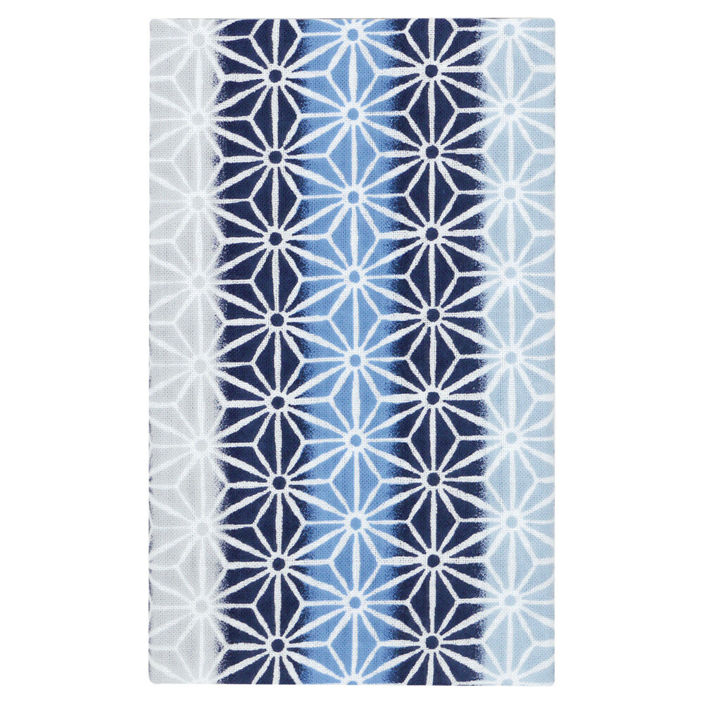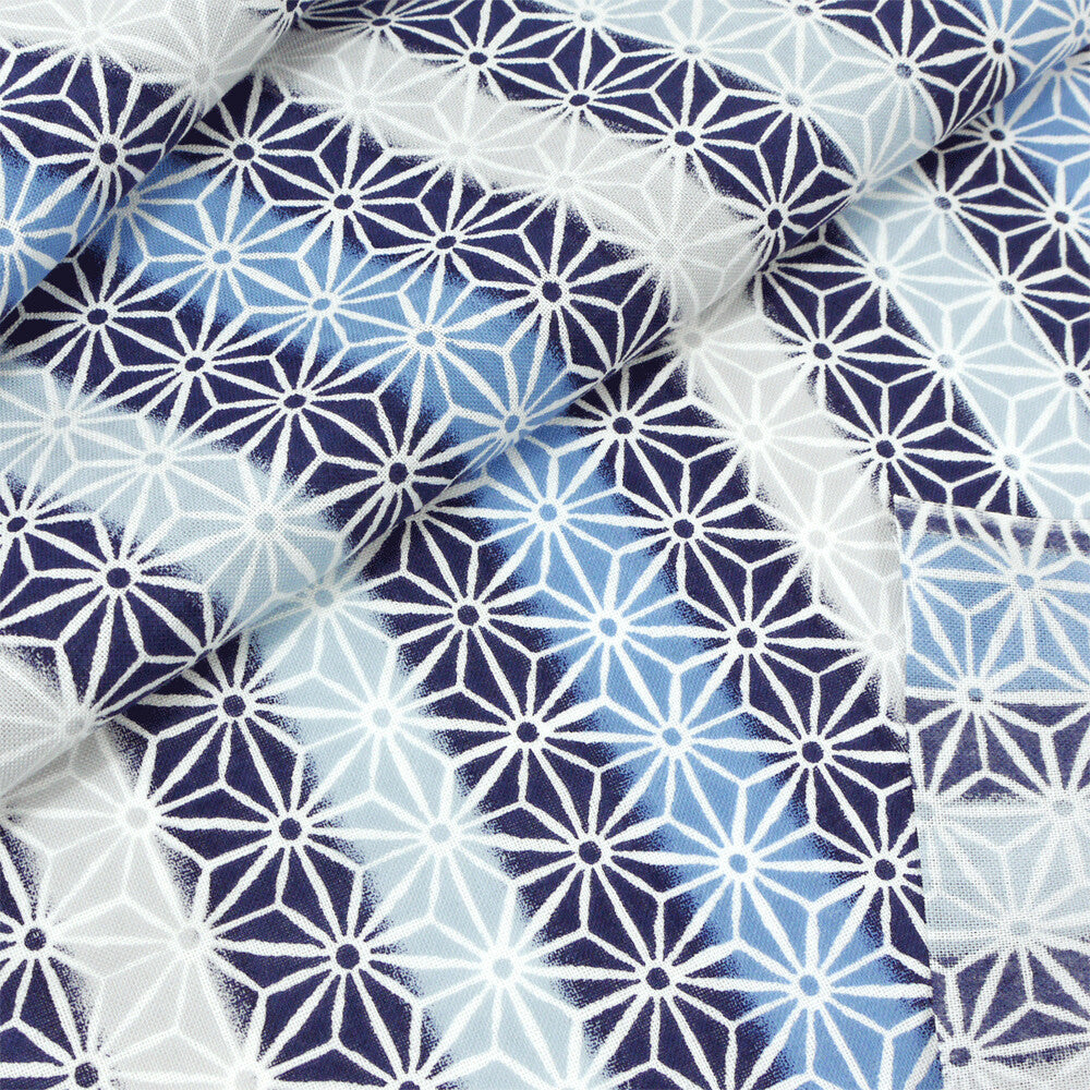 The design captivates with a fascinating visual depth created by a vertical gradient in various indigo and blue tones. The white lines of the Asanoha (麻の葉) pattern lie across the background like a fine net, forming a rhythmic structure of stars and hexagons. The combination of the deep blue and the geometric rigor lends the scarf a cool, masculine elegance, making it a versatile accessory for modern interiors.