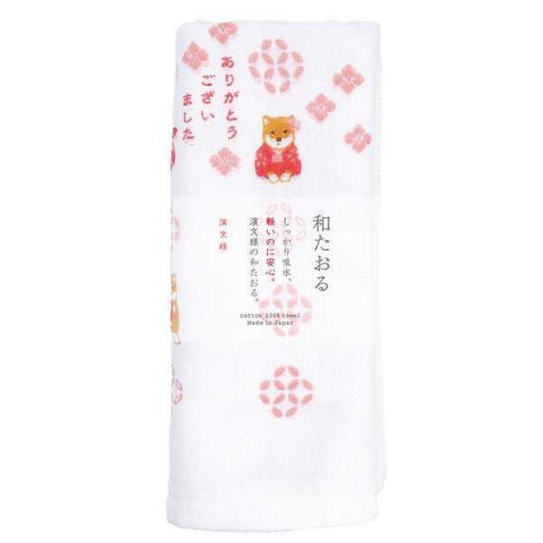 The design features a small dog in a festive red robe, surrounded by harmonious geometric patterns in soft pink tones. The message "Arigatou gozaimashita" (Thank you very much) makes this towel an ideal gift or a thoughtful gesture in everyday life. Unlike the traditional, smooth tenugui, this wa-taoru is a functional hybrid: the printed front is made of fine cotton, while the back is crafted from soft, absorbent terry cloth – perfect for quickly drying your hands on the go.