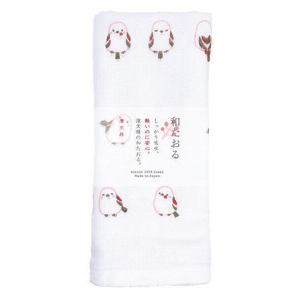 This charming little towel is namedちゃんこいシマエナガ (Chankoi Shimaenaga) – “Cute Long-tailed Tit”. It is dedicated to the popular Shimaenaga (シマエナガ) , the Japanese long-tailed tit, often affectionately called “snow fairies” because of their round, white plumage.
