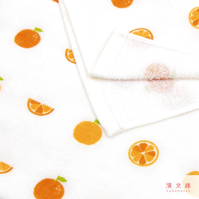 The design comes from HAMAMONYO in Yokohama. Thanks to the traditional Yokohama wet printing technique, the colors are particularly long-lasting and the contours of the juicy oranges remain razor-sharp, giving the towel a particularly high-quality look and feel.