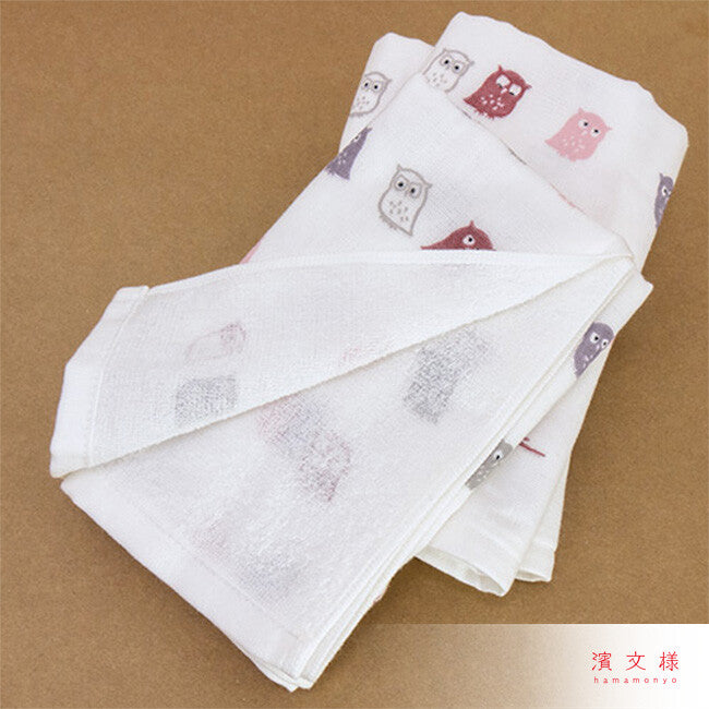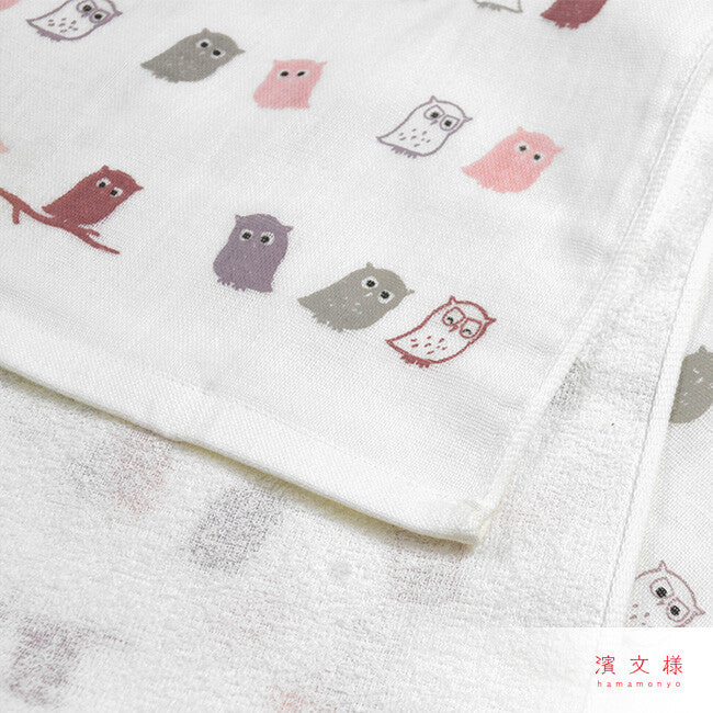 The design features a colorful flock of stylized owls in various colors such as red, gray, and purple, playfully scattered across a white background. As part of the Wa-taoru series, this towel offers a functional advantage over the classic tenugui: the reverse side is made of soft, absorbent terry cloth, while the front, crafted from finely woven cotton, perfectly showcases the detailed pattern.