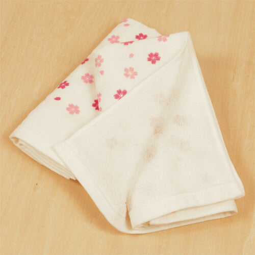 This elegant little towel is called Mamezakura , which translates to "Little Cherry Blossom." The design features delicate, pink sakura blossoms scattered seemingly at random across a white background, capturing the fleeting beauty of a Japanese spring.