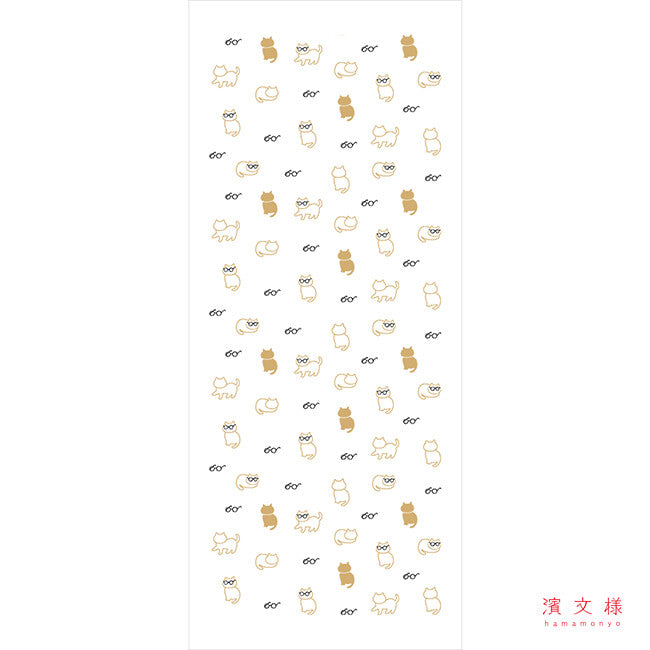 This charming little towel is calledねこめがね (Neko Megane) – "Cats with Glasses." The design features minimalist silhouettes of cats in warm mustard yellow and delicate outlines, some of which playfully wear glasses. The combination of understated elegance and humorous details makes this towel a special accessory for all cat lovers.