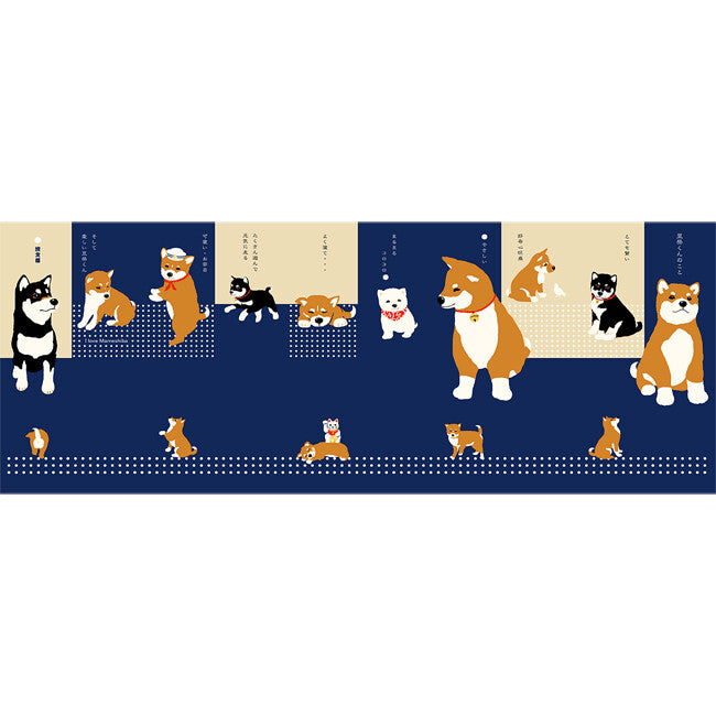 Das Design besticht durch seine klare Ästhetik auf einem tiefen, navyblauen Hintergrund, von dem sich das warme Braun und Weiß des Shiba-inu (柴犬) kontrastreich abhebt. Das Besondere an diesem Produkt ist das Format als „Tenugui-Buch“: Durch eine spezielle Heftung lässt es sich wie ein echtes Buch durchblättern und erzählt eine kleine Geschichte, bevor es vollständig entfaltet als klassisches Tenugui-Tuch genutzt werden kann. Es fängt den aufgeweckten und treuen Charakter dieser besonderen Hunderasse perfekt ein.