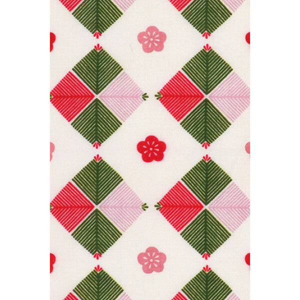 Im Zentrum stehen die rautenförmigen Hishi (菱), die hier aus stilisierten Kiefernnadeln der Matsu (松) gebildet werden – ein Symbol für Langlebigkeit und Beständigkeit. Dazwischen setzen kleine, leuchtend rote und rosafarbene Koume (小梅), die kleinen Pflaumenblüten, frische Akzente. Die Kombination aus kräftigem Grün und winterlichem Rot auf hellem Grund verleiht dem Design eine festliche und zugleich beruhigende Stimmung, die an die ersten sonnigen Tage des Jahres erinnert.